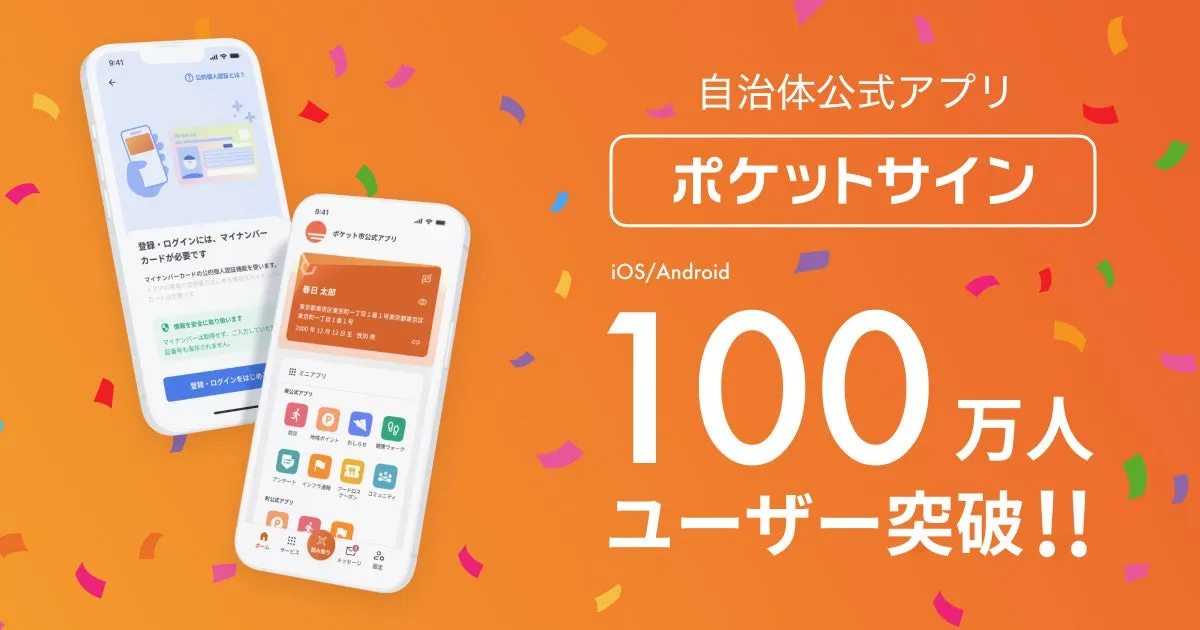 「ポケットサイン」は、自治体が提供する様々なサービスを集約した公式アプリです。このたび、マイナンバーカードを利用した登録者数が100万人を超えるという大きな成果を収めました。これは、全国の自治体による導入と積極的な支援の結果であり、多くの住民の皆様にご利用いただいていることに感謝の意を表します。