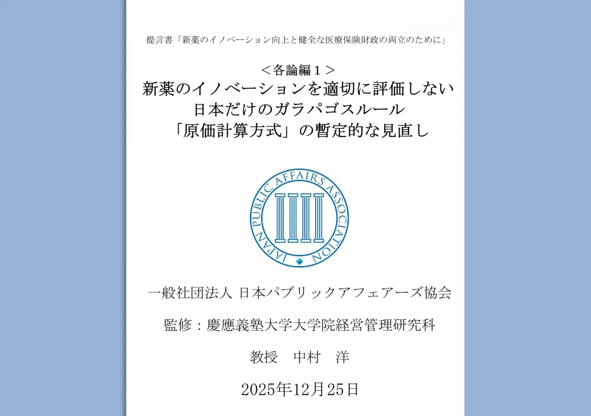 2025年12月25日、一般社団法人日本パブリックアフェアーズ協会が新たな政策提言書を発表しました。それは、現行の薬価算定方式に対する問題提起と改善案をまとめたものです。日本の医療市場において「原価計算方式」に依存していることが、イノベーションの発展を妨げているという厳しい現実を浮き彫りにしています。