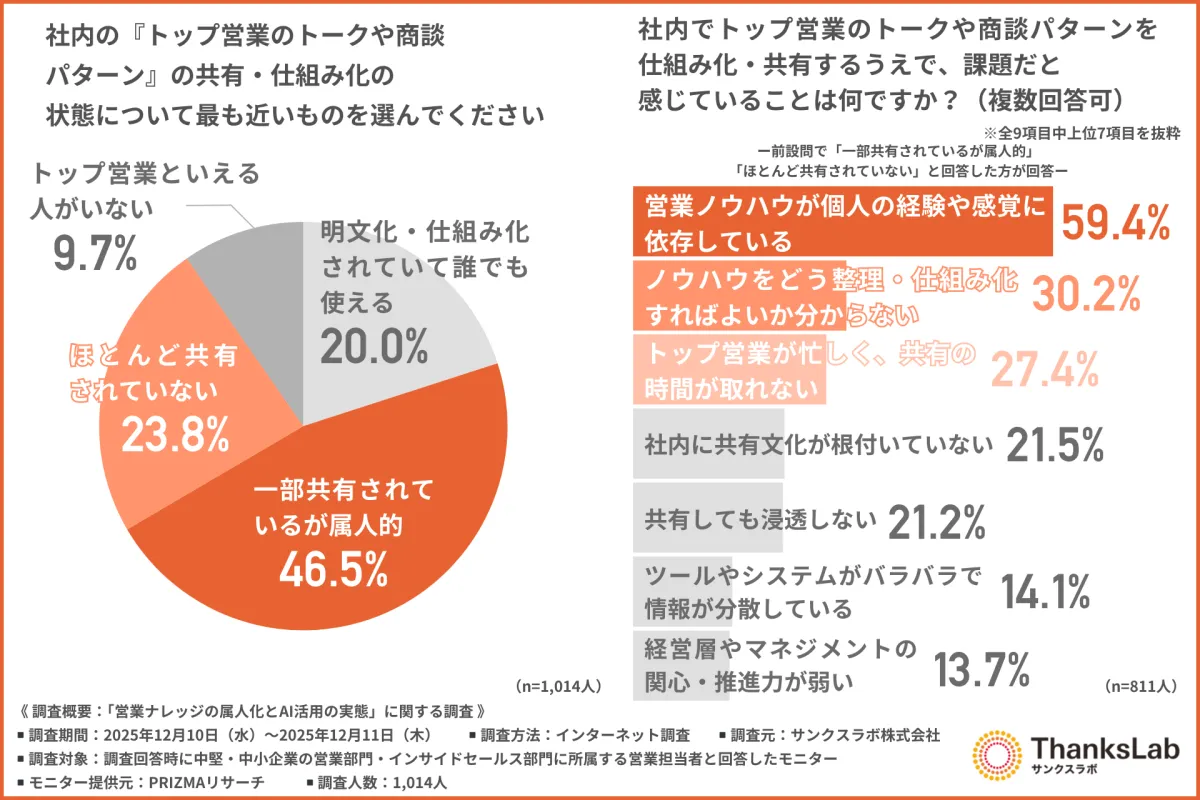 今回の調査は、福岡県福岡市に本社を置くサンクスラボキャリア株式会社が実施しました。対象は、社員100名以上の中堅・中小企業の営業部門やインサイドセールス部門に所属する営業担当者1,014人です。調査期間は2025年12月10日から11日の2日間にわたりました。わずか2割の企業がトップ営業のナレッジを仕組み化しているという結果が出ていますが、それに対する課題は何でしょうか。