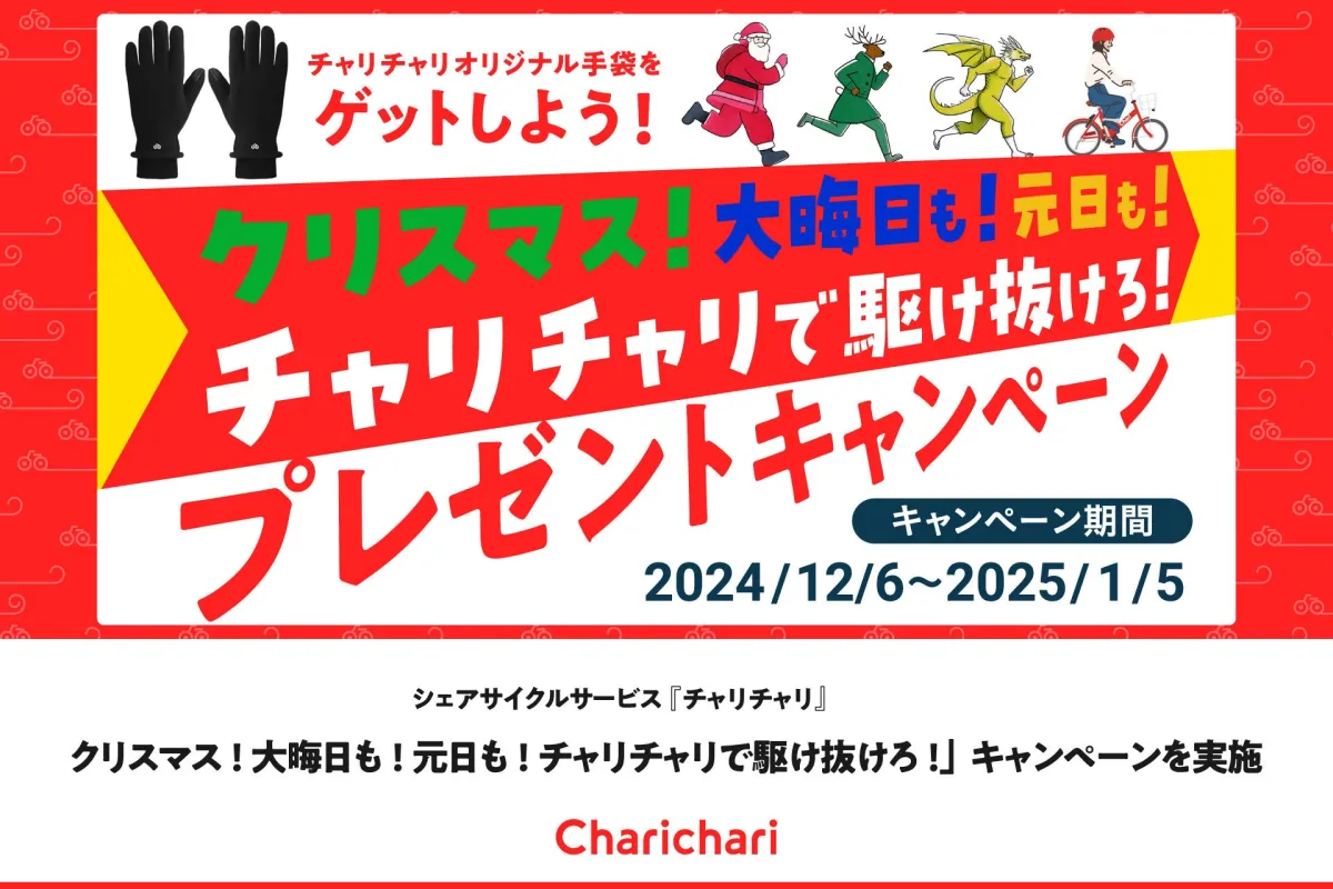 シェアサイクルサービス「チャリチャリ」を運営するチャリチャリ株式会社が、2024年末から2025年の始まりにかけて特別なプレゼントキャンペーンを実施します。キャンペーン名は「クリスマス!大晦日も!元日も!チャリチャリで駆け抜けろ!」。このキャンペーンでは、抽選で70名様にオリジナル限定グッズ「チャリチャリ手袋」がプレゼントされます。キャンペーンの期間は2024年12月6日から2025年1月5日まで。冬の自転車ライドにぴったりの暖かい手袋を手に入れるチャンスです!