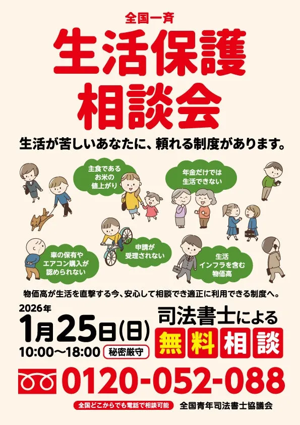 2026年1月25日(日)、全国で生活保護に関する相談会が行われます。この相談会では、生活にお困りの方々が気軽に法律の専門家に相談できる機会を提供します。相談は、フリーダイヤルを通じて行い、全国どこからでもアクセスが可能です。