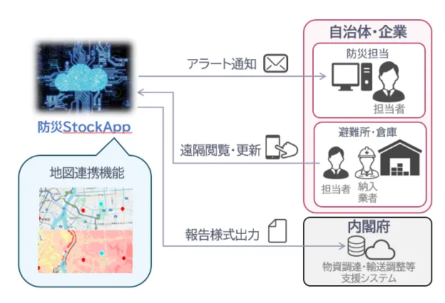 地図連携機能:地図やハザードマップと連携し、備蓄拠点の視覚的確認が可能。これにより、災害時の迅速な対応がサポートされます。