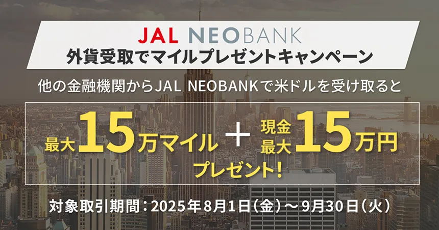 このキャンペーンは、JALマイレージバンクの会員を対象にしており、外貨をJAL NEOBANKの外貨預金口座で受け取ることでマイルが貯まります。具体的には、2025年8月1日から9月30日までの間に他の銀行から外貨を送金し、一定金額以上を受け取った顧客には、受取金額に応じたマイルがプレゼントされます。