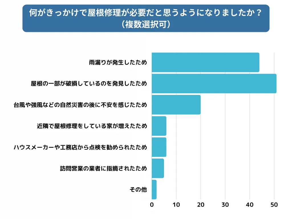 アンケート結果によると、屋根修理を意識したきっかけとして「屋根の一部が剥がれたり、破損しているのを発見した」(51件)や、「雨漏りが発生したため」(44件)が最も多く挙がりました。天候によって不安を感じるという声も多く、自然災害が引き金となることがあるようです。これらを踏まえて、屋根のメンテナンスは定期的な点検と補修が必要だと言えます。