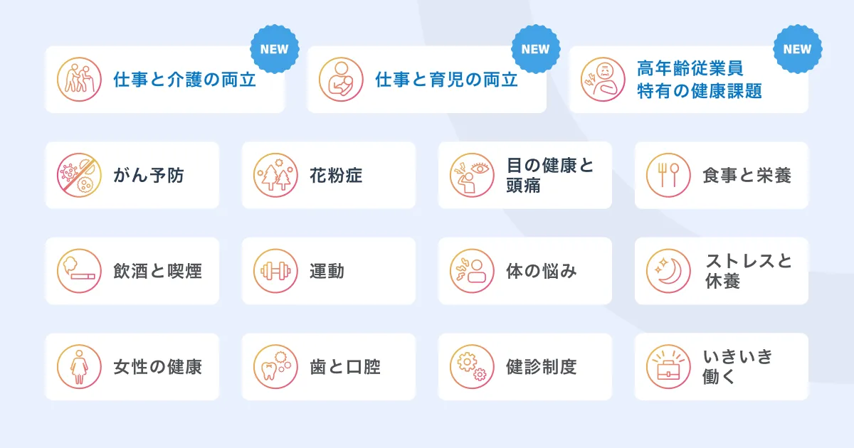 これらの新カテゴリは、従業員が直面するさまざまなライフスタイルの変化や健康課題に対応するために設計されています。特に介護や育児に関するサポートは、社会的に重要視されるテーマであり、働きながら家庭と仕事を両立させるための知識を深めることが求められています。さらに、高年齢従業員の健康に関しても配慮が必要な時代になり、安心して働き続けるための基盤作りが急務です。