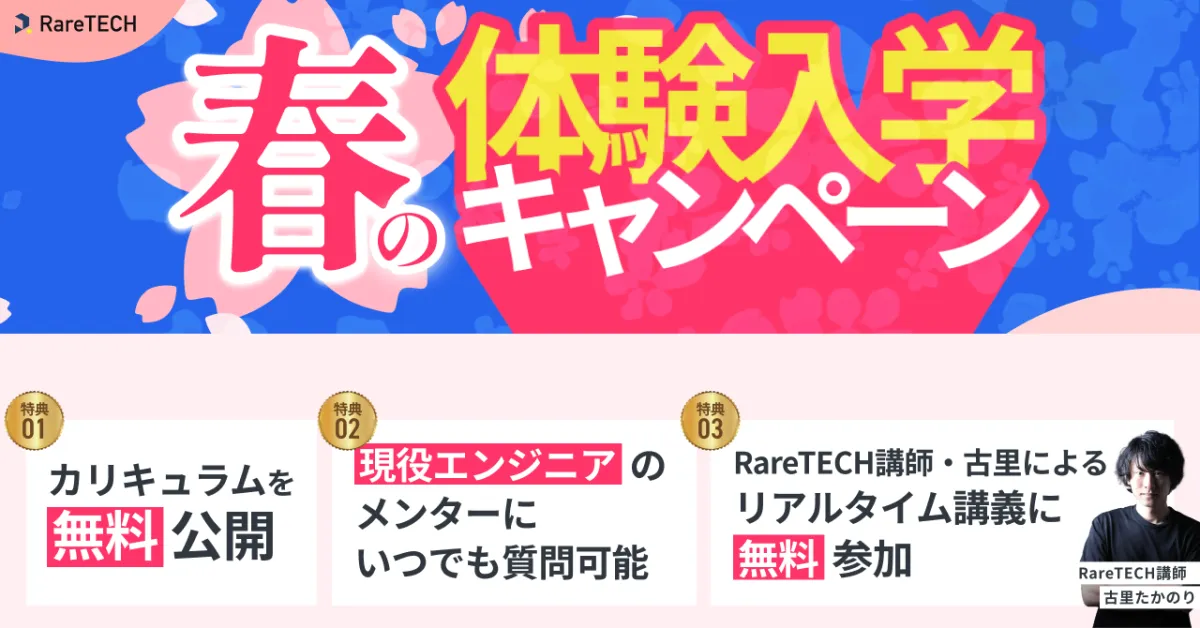 RareTECHは「教材を渡して終わり」ではなく、手厚いサポートと体系的なカリキュラムを提供します。この春の体験入学キャンペーンは、真剣にエンジニアという新たなキャリアを考えている方々にとって、素晴らしい体験となることでしょう。自分に合った学習環境を見つけ、自走できるエンジニアとしての第一歩を踏み出してみてはいかがでしょうか。