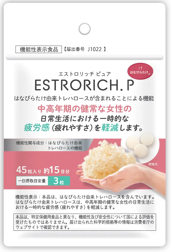 この製品には、ハナビラタケ由来のトレハロースが使用されており、疲労感を軽減する機能が確認されています。特に、40代・50代の健常な女性を対象としたヒト臨床試験では、簡略更年期指数(SMI)の改善が報告されており、その中での「疲れやすさ」に対する効果が実証されています。この成分は、長年にわたる研究成果を基に開発されました。