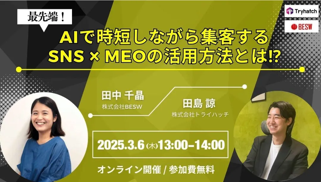 2025年3月6日(木)に開催されるこの無料オンラインセミナーでは、最前線のマーケティング手法について学びます。主催は株式会社ベクトルの子会社、株式会社トライハッチです。このセミナーでは、SNSとMEO(マップエンジン最適化)の効率的な活用方法に焦点を当てています。AI技術を駆使して、短時間で集客効果を最大化する方法について深く掘り下げます。
