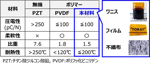 今回の圧電ポリマーは、東レが長年にわたり培ったポリマー分子設計技術と高次構造制御技術を活かして開発されています。特に注目すべきは、200℃以上でも分極構造が維持されるため、高温環境でも安定して圧電性能を発揮できる点です。この特性により、PVDFでは対応できなかったさまざまな高温アプリケーションでの利用が実現可能となりました。