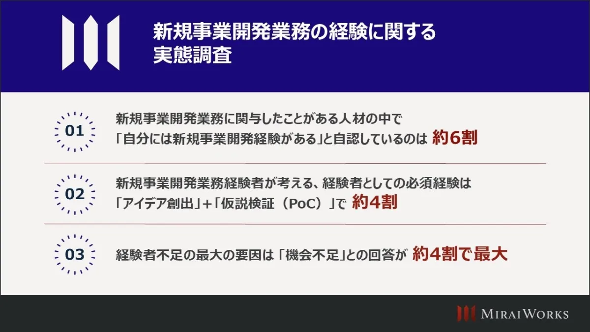 調査では「新規事業そのものの機会が少ない」との意見が多く、機会不足が経験者不足の根本原因であることが浮かび上がりました。