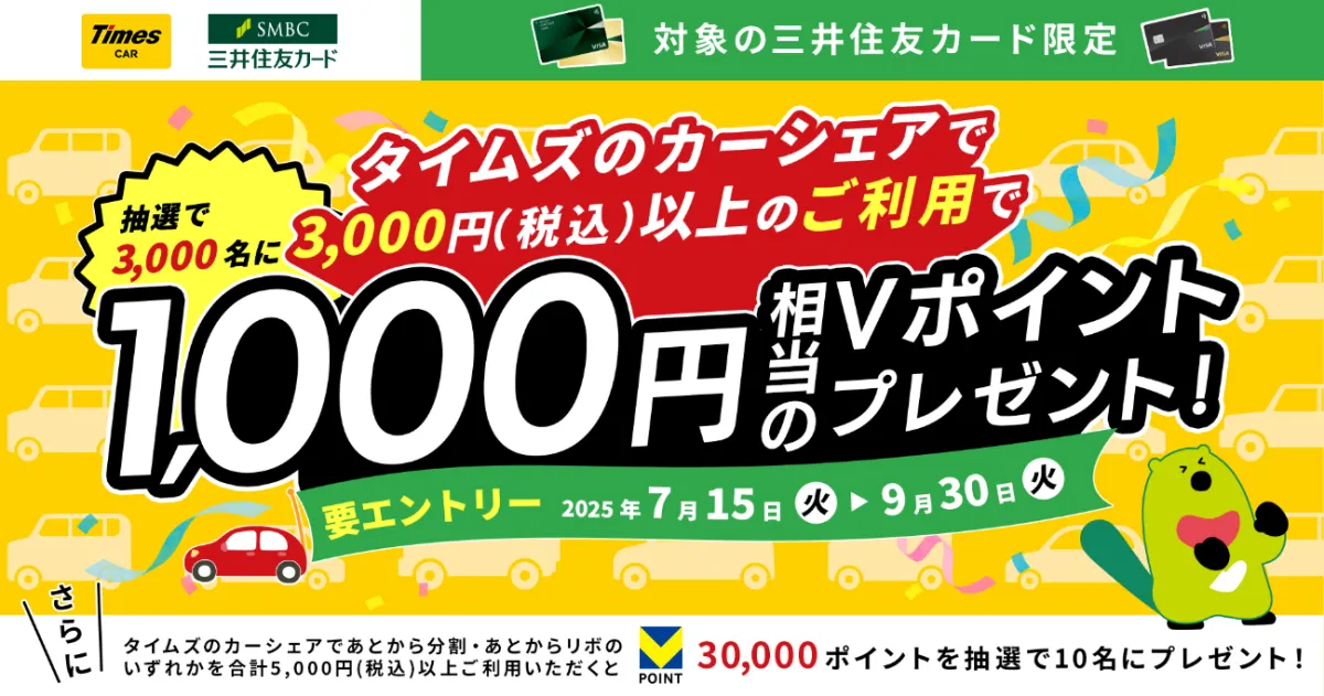 このキャンペーンは、2025年7月15日(火)から9月30日(火)まで実施されます。参加するためには、条件を満たす必要がありますが、まずはタイムズカーの個人会員に登録し、その際に対象の三井住友カードを登録することが第一歩です。条件を満たすことで、3,000名様に1,000円相当のVポイントをプレゼントします。
