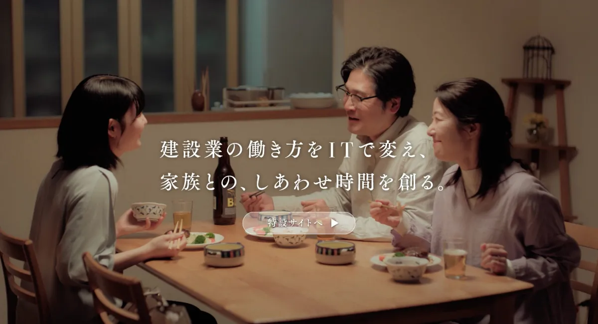 CMの中では、建設業界の労働時間に関する問題にフォーカスし、それを解決するために日々奮闘する主人公の姿が描かれます。建設業界において家族と過ごす時間が持てない父親を見つめる主人公は、成長するにつれてその思いを抱えるようになり、最後には主人公が同社で働き出すことでその課題の解決へ向けた一歩を踏み出します。