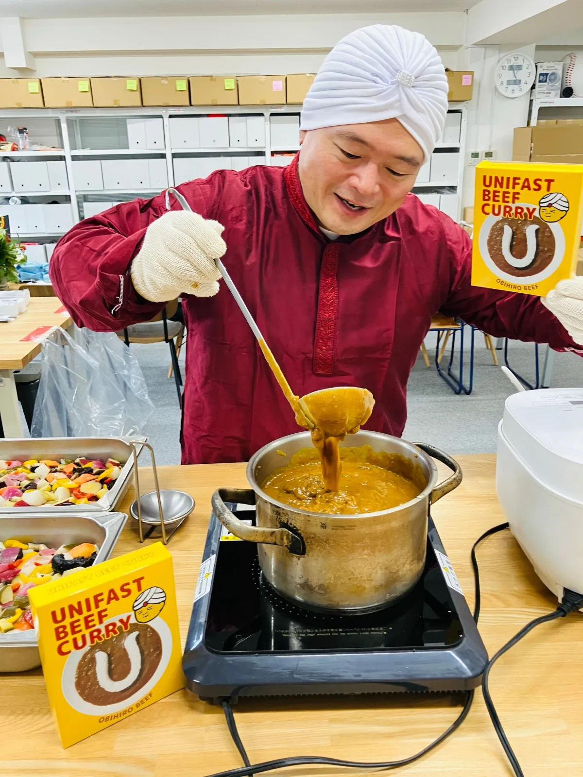 2025年1月6日、新年度の始業日として社内カレー試食会が行われました。社長の橋本敦氏がインド風の衣装を纏い、試食用のレトルトカレーを社員に振る舞いました。試食会では社員全員が実際にカレーを味わい、その体験を基に顧客への提案につなげることが求められました。
