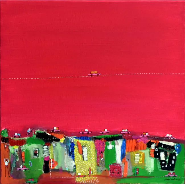 ドウツのアートは、彼がもたらすアフリカの生命力そのものと言えるでしょう。彼の作品は、アクリルやパステル、コラージュを駆使した鮮やかな色使いが特徴であり、観る者に力強さと希望を与えます。特にアフリカの大地から湧き出るような色彩は、他のアートでは味わうことのできない独特なものです。展覧会では、100cmを超える大作品から、小ぶりな作品まで様々なタイプが並ぶ予定です。