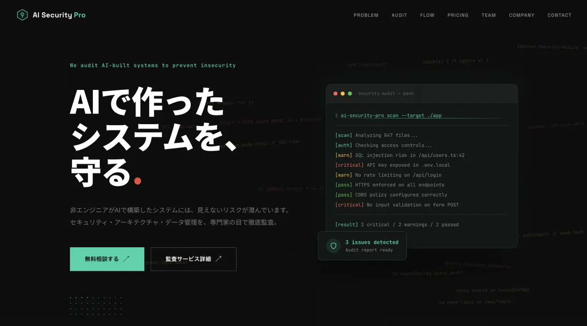 テクノロジーが進化する現代、AIを使ってシステムを構築することが容易になっています。しかし、それに伴い新たなリスクも浮上しています。そのため、専門的な監査サービスが不可欠です。株式会社AntAIが提供する『AIセキュリティ顧問 Pro』は、AIツールで作成されたWebサービスや業務システムを対象にした監査サービスです。