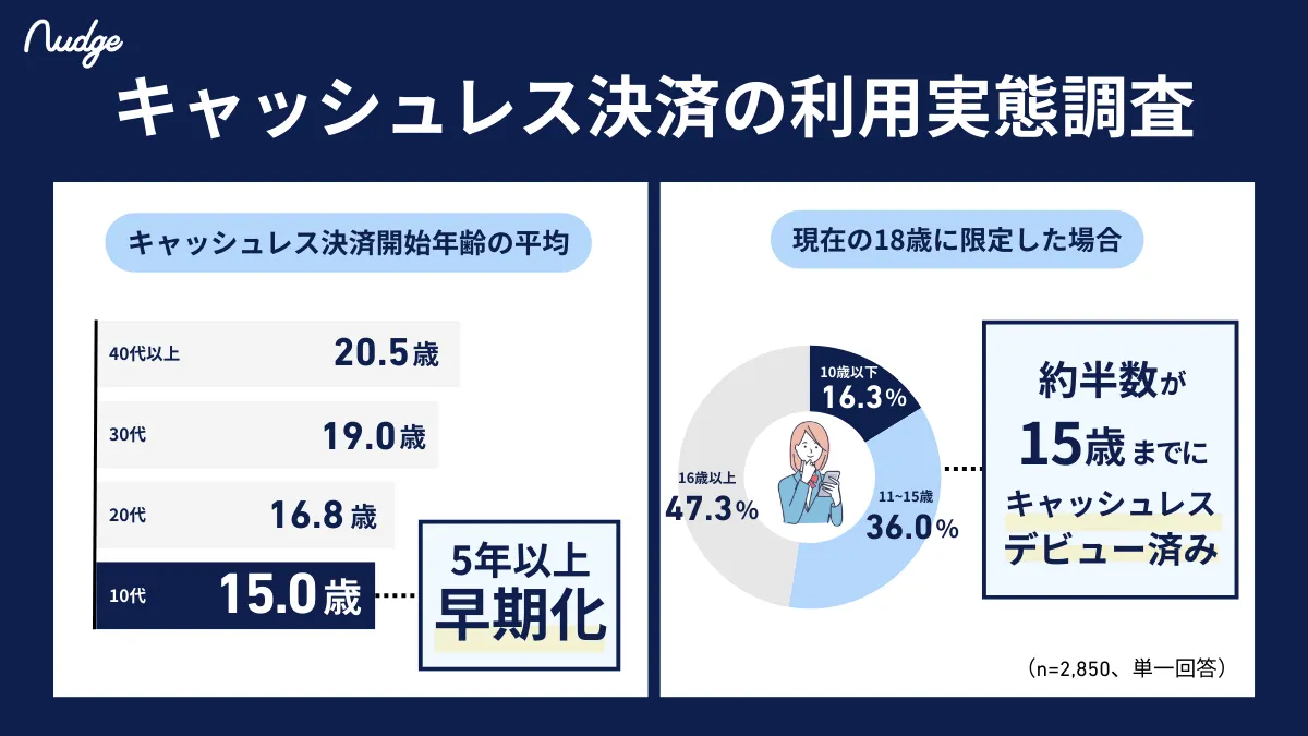 ナッジ株式会社が実施した調査によれば、18歳の約半数が15歳までにキャッシュレス決済を始めていることがわかりました。この調査は、次世代クレジットカード「ナッジカード」を利用する2850人を対象に行われました。