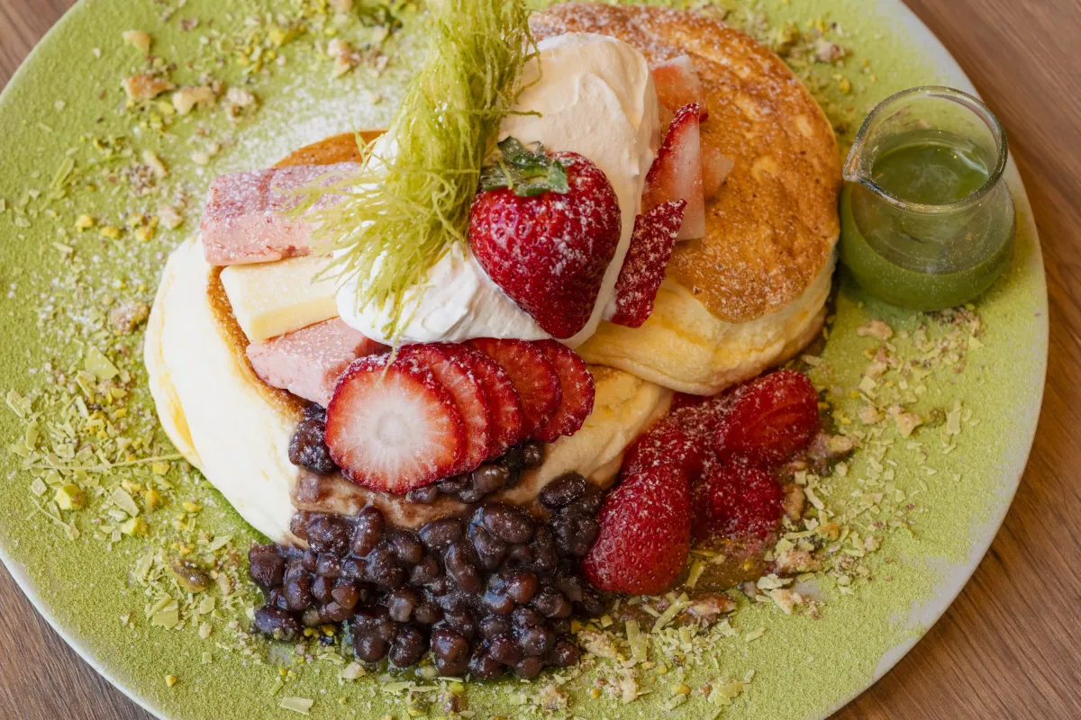 特製のパンケーキを更に楽しむために、まずは2種類のバター(発酵バターといちごバター)と、北海道産の塩あずきを添えて味わってみてください。次に、香り豊かな宇治抹茶ソースや抹茶パウダー、胡桃の食感と共に、春いちごとパンケーキのハーモニーを味わいましょう。この時期だけの特別なパンケーキで、贅沢な春を過ごしてみてはいかがでしょうか。