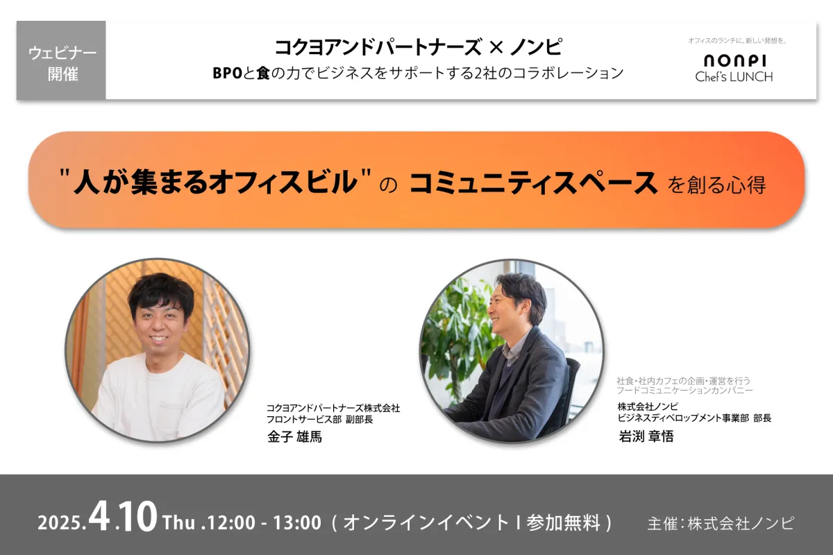 オフィスビルの未来を切り開くこのウェビナーは、食とBPOの視点から新たな価値を生み出すのに十分な学びの場となるでしょう。参加することで、次世代のオフィス環境を考えるヒントを得られること間違いありません。どうぞお見逃しなく!