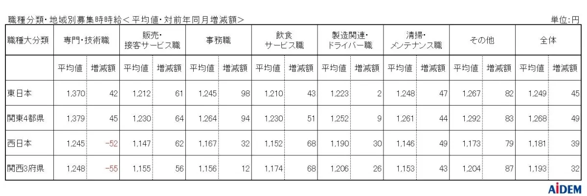 一方、西日本エリアのパート・アルバイトの平均時給は1,181円で、前年同月比39円の増加となっています。職種ごとの分析では、「専門・技術職」が平均1,245円で減少が見られますが、その他の職種は軒並み前年を上回っています。「製造関連・ドライバー職」が1,190円(同30円増)や「飲食サービス職」1,152円(同68円増)も好調です。