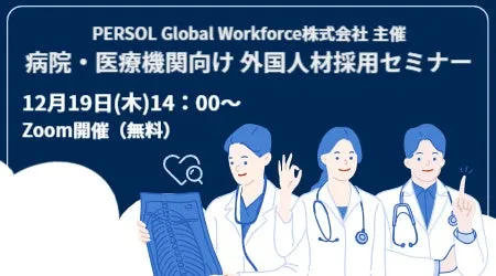 2023年12月19日木曜日、PERSOL Global Workforce株式会社が主催する「外国人材採用オンラインセミナー」が予定されています。本セミナーは、病院や医療機関の経営者や人事担当者を対象に、外国人材の採用に関連する情報を提供するために設計されています。参加は無料で、興味のある方は事前に申し込みが必要です。