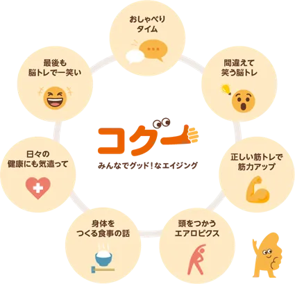 『コグー』は、国が定める指針に従って、運動、脳トレ、栄養、交流を一つのパッケージとして提供します。これにより、利用者は多角的に認知機能の維持・向上に取り組める設計がされています。