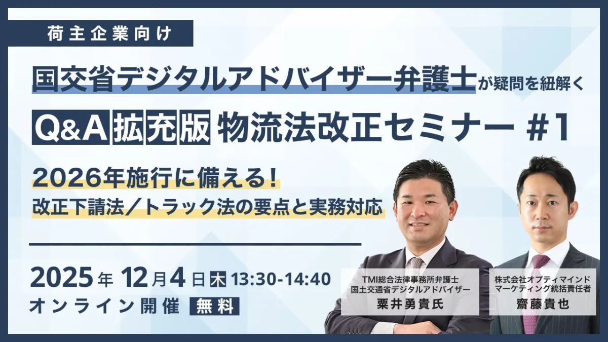 株式会社オプティマインドは、2025年12月4日(木)にオンラインで開催される「国土交通省デジタルアドバイザー弁護士が疑問を紐解く物流法改正対応セミナー」の第1回を告知しました。このセミナーでは、法令遵守と実務対応をテーマに、TMI総合法律事務所の弁護士である粟井勇貴氏が登壇し、特に2026年から施行が予定される改正法に焦点を絞ります。