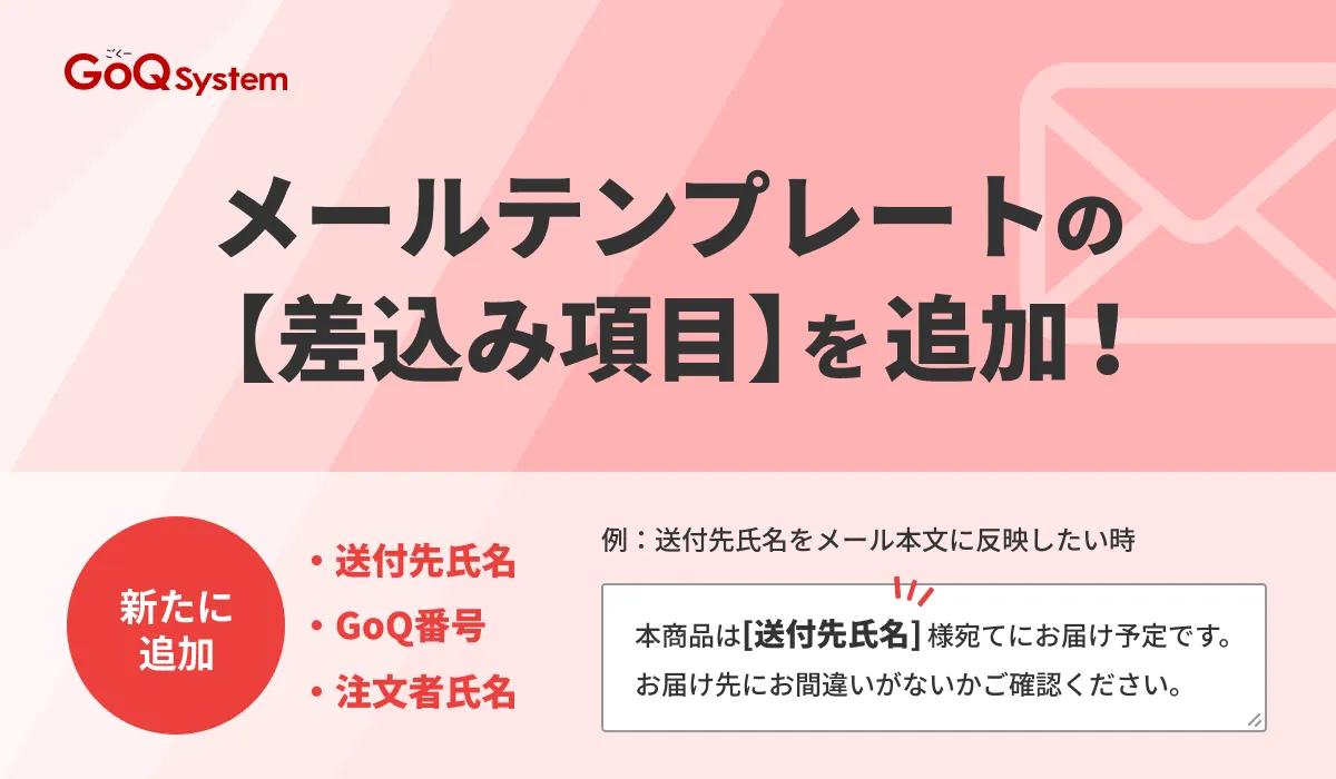 GoQSystemの「メール差込み項目」は、通販業務における各種メールテンプレートに、個別の情報を自動で差し込むことができる機能です。具体的には、以下のような情報を使用できます。