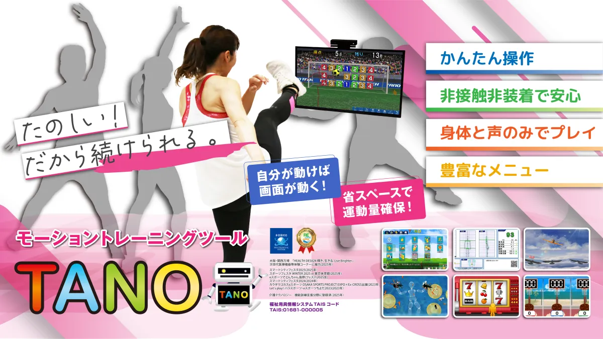 今回の注目は、eスポーツ「TANO」を使った体験型コンテンツです。TANOは、モーションセンサーを駆使した非接触・非装着型の福祉機器で、身体がそのままコントローラーとなる次世代の運動体験を提供します。300種以上の運動や発声、認知機能向上のためのプログラムが豊富に用意されており、楽しみながら自発的に参加できるのが大きな魅力です。何より、日常の動作やコミュニケーション改善に貢献する点でも、多くの方々に試していただきたいアイテムです。
