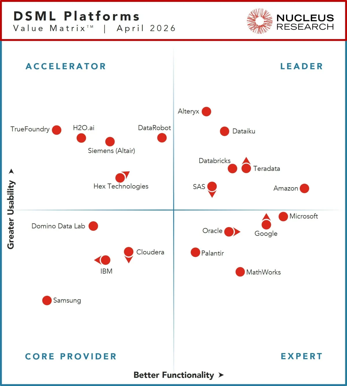 テラデータがNucleus Researchによる2026年版データサイエンスおよび機械学習バリュー・マトリックスにおいて「リーダー」として選ばれました。同調査は、業界内での機能性と使いやすさを基準にソフトウェアプラットフォームを評価するもので、テラデータはその中で際立った存在として認識されています。