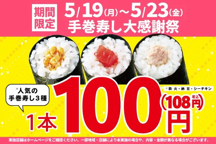 小僧寿しが5月19日から23日までの5日間、特別イベント「手巻寿し大感謝祭」を開催します。この期間、人気の手巻寿しが特別価格の100円(税込108円)で楽しめるというもので、日頃の感謝の気持ちを込めたイベントです。