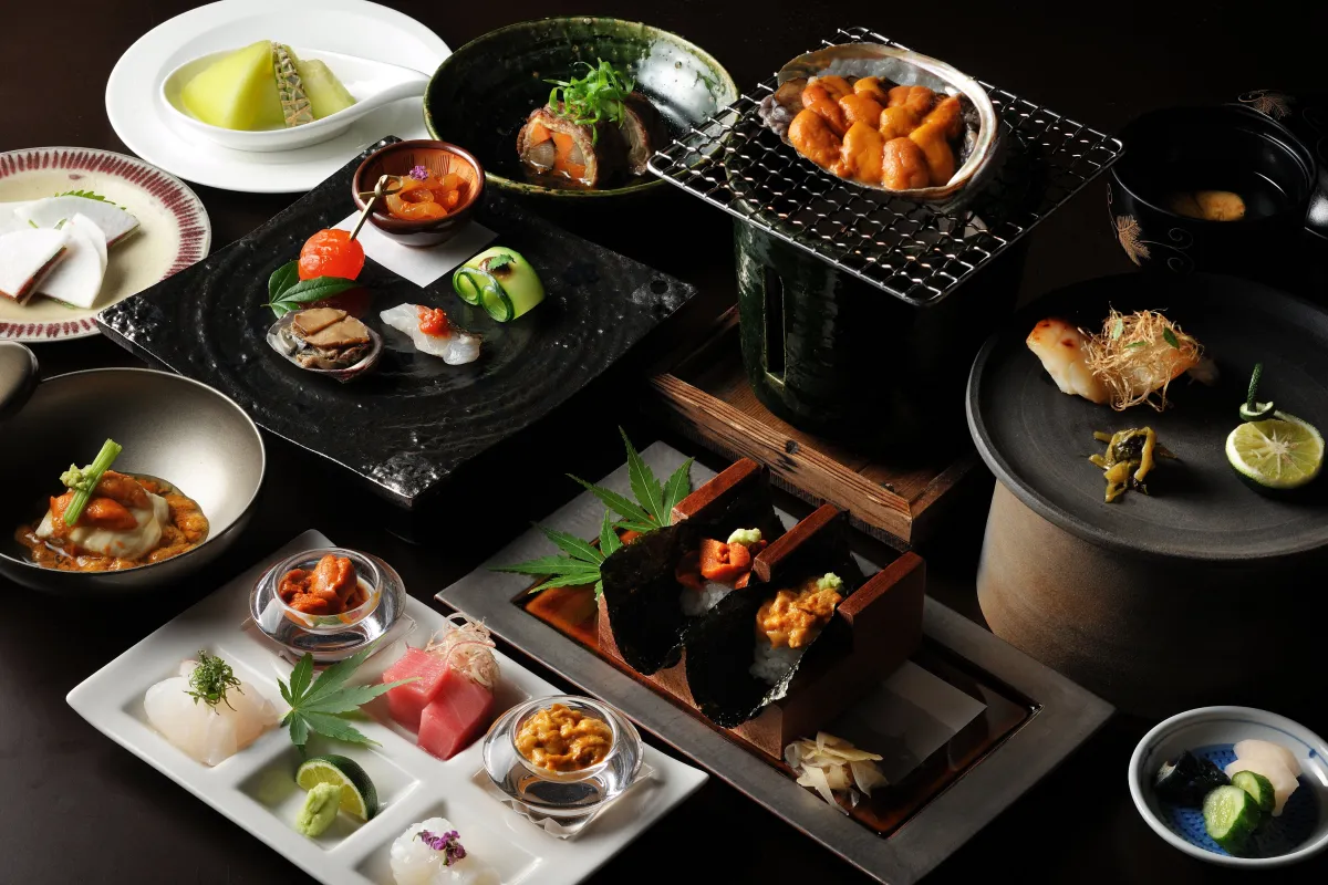 料理の一例には、前菜として真鯛の昆布〆に汐ウニ、トマト蜜漬け、そしてウニ茶碗蒸しなどがあります。同様に、刺身には九州産の赤ウニと北海道産のウニ、揚物にはウニ真丈餡かけが並ぶなど、どれも個性的な料理が目を引きます。