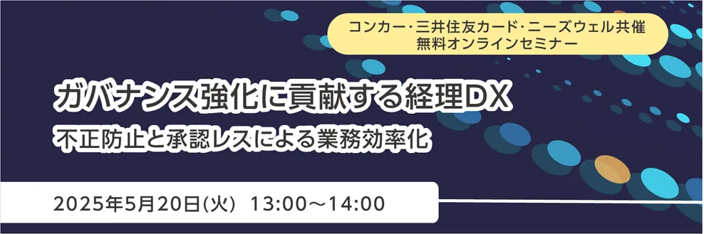 2025年5月20日にオンラインで開催される無料セミナー「ガバナンス強化に貢献する経理DX」についての詳細をお伝えします。このセミナーは、株式会社ニーズウェルと、株式会社コンカー、三井住友カードが共同で開催するもので、経理業務の効率化に役立つ情報が提供されます。