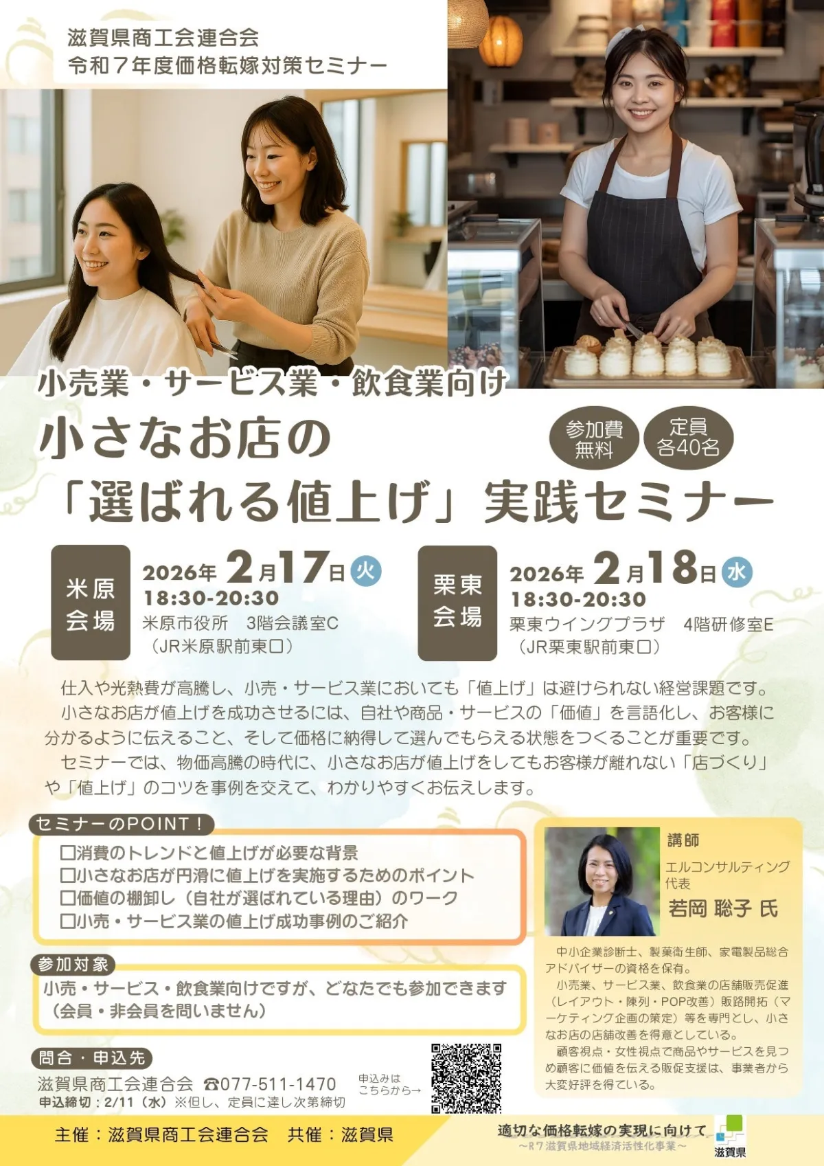滋賀県商工会連合会は、2024年2月17日と18日、滋賀県内の米原市と栗東市で「価格転嫁セミナー」を開催します。このシンポジウムは、小売業やサービス業、飲食業を営む中小・小規模事業者を対象に、厳しい経済環境下でも成功を収めるための重要な知識を提供することを目的としています。