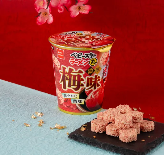 この商品は、梅好きの方にはもちろんのこと、春を感じたい方にもおすすめです。冷蔵庫で冷やすもよし、あたたかい飲み物と一緒に楽しむもよし。今年の春は、この『ベビースターラーメン丸(濃厚梅味)』で特別なひとときをお過ごしください。
