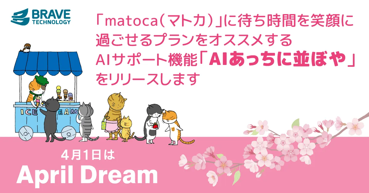 ブレイブテクノロジーのビジョンは「待ち時間を笑顔で過ごせる世の中を実現する」ことであり、これにより企業価値を向上させ、従業員の日々の生活を豊かにしたいと考えています。今回のリリースは、4月1日の夢を発信する「April Dream」にも賛同した形での発表です。