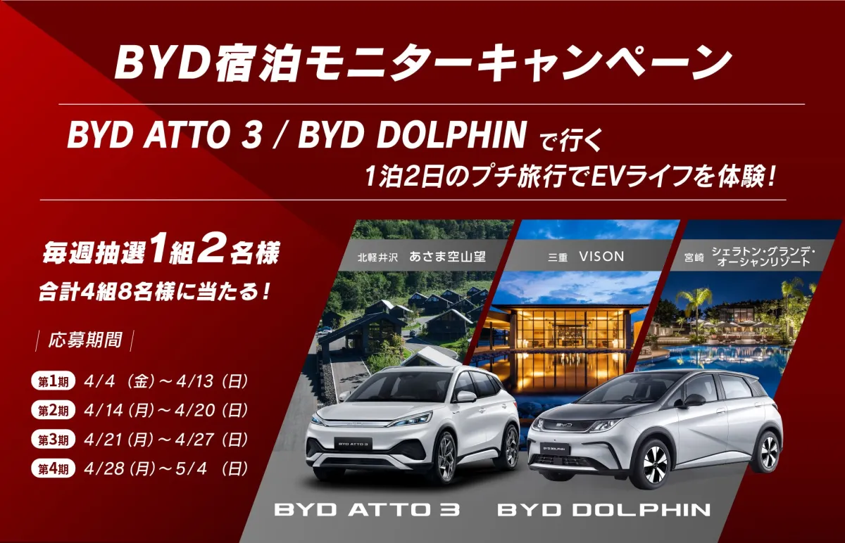 このキャンペーンでは、当選者に新緑の中を走る2つのBYDの電気自動車、「BYD ATTO 3」と「BYD DOLPHIN」の試乗体験が用意されています。EVならではの静かな走行を体感しながら、絶景が広がるドライブを楽しむことができます。これに合わせて、あさま空山望での宿泊もできるので、特別なリゾート体験が一緒に味わえます。