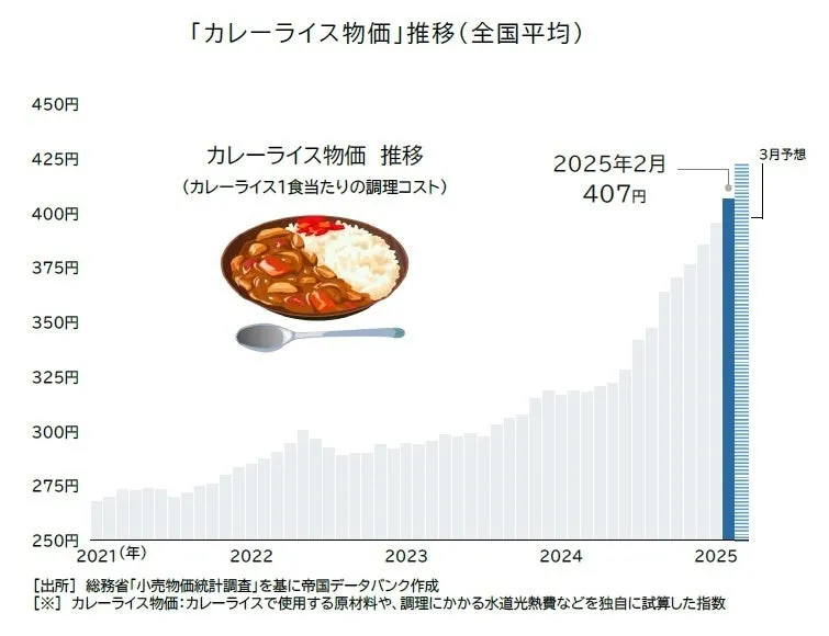2025年2月、日本のカレーライスの物価が1食あたり407円に達しました。これは前年同月の319円から88円も上昇し、初めて400円の大台を突破。長期的な物価上昇の影響が色濃く表れています。さらに、11ヶ月連続で最高値を更新しており、この現象は家計にとって大きな打撃となっています。特に3月には420円前後までの上昇が予測されており、その背景にはコメや野菜類の価格高騰がわかります。