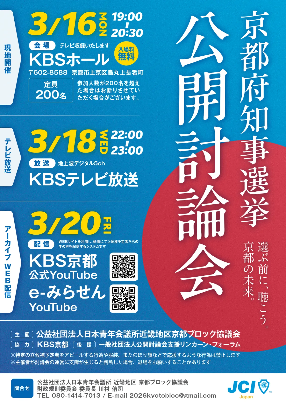 この公開討論会は、公平・中立な立場から候補者の政策や理念を府民に伝える貴重な機会です。投票率を向上させるためには、府民が自らの意思で未来を選ぶための情報を受け取ることが不可欠です。京都府の持続可能な発展のために、このような取り組みが重要であることを私たちは知っています。関連するお問い合わせは、日本青年会議所 近畿地区 京都ブロック協議会の財政規則委員会委員長である川村侑司まで、メールにてお願いします(Mail: