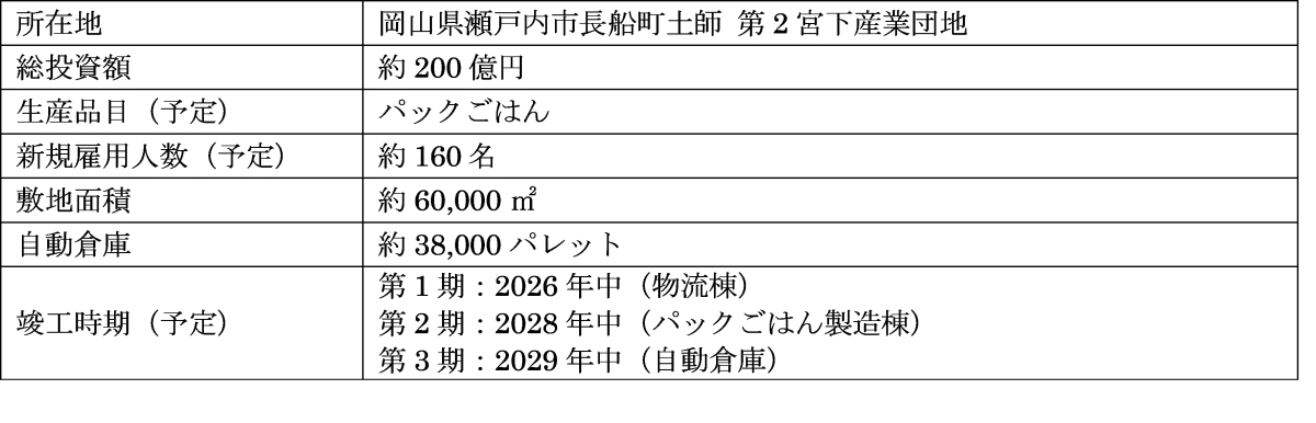 この新工場は、中国・四国地方および西日本全域を対象とした製造・物流拠点として機能する予定です。当初は家電製品の生産が予定されていましたが、国内外で需要の高まっている「パックごはん」の生産に計画変更されました。