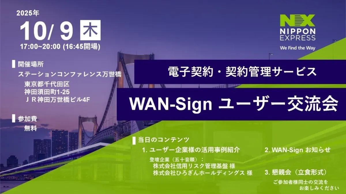 株式会社NXワンビシアーカイブズが提供する電子契約・契約管理サービス「WAN-Sign」のユーザー交流会が、2025年10月9日(木)17時から東京で開催されます。このイベントは、ユーザー同士の情報交換やWAN-Signの活用事例の紹介を通じて、より有効にサービスを活用してもらうことを目的としています。参加は無料で、電子契約に関心がある方々には貴重な機会となることでしょう。