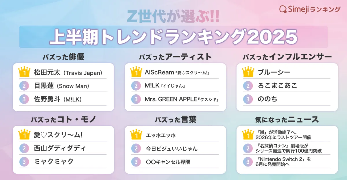 2025年上半期のZ世代トレンドは、俳優、アーティスト、インフルエンサー、言葉と、多岐にわたって多様性に富んでいます。特にSNSとの融合した流行は、彼らの生活や思考に大きな影響を与え続けているのです。今後もSimejiランキングを通じて、これらのトレンドを深堀りし、Z世代のリアルな価値観に迫っていきたいと考えています。