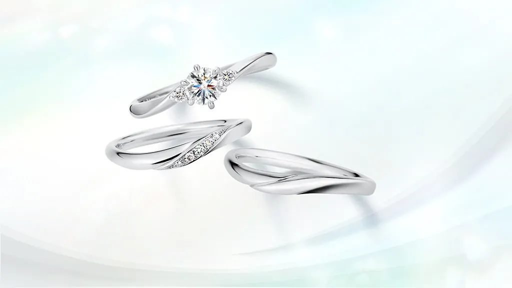 結婚指輪は、ゆるやかなウェーブラインのデザインで、薬指に心地よくフィットします。こちらも3つの面があり、例えばメレダイヤモンドの有無を選択したり、異なるテクスチャを加工したりすることで、自分だけのカスタマイズを楽しめます。価格は、メレダイヤモンドを5ピースセッティングしたモデルが¥145,200(税込)、シンプルなモデルは¥117,700(税込)で提供されています。さらに、一部店舗では、メレダイヤモンドが17ピースセットされたハーフエタニティデザインも展示中です。こちらの価格は¥208,340(税込)となります。