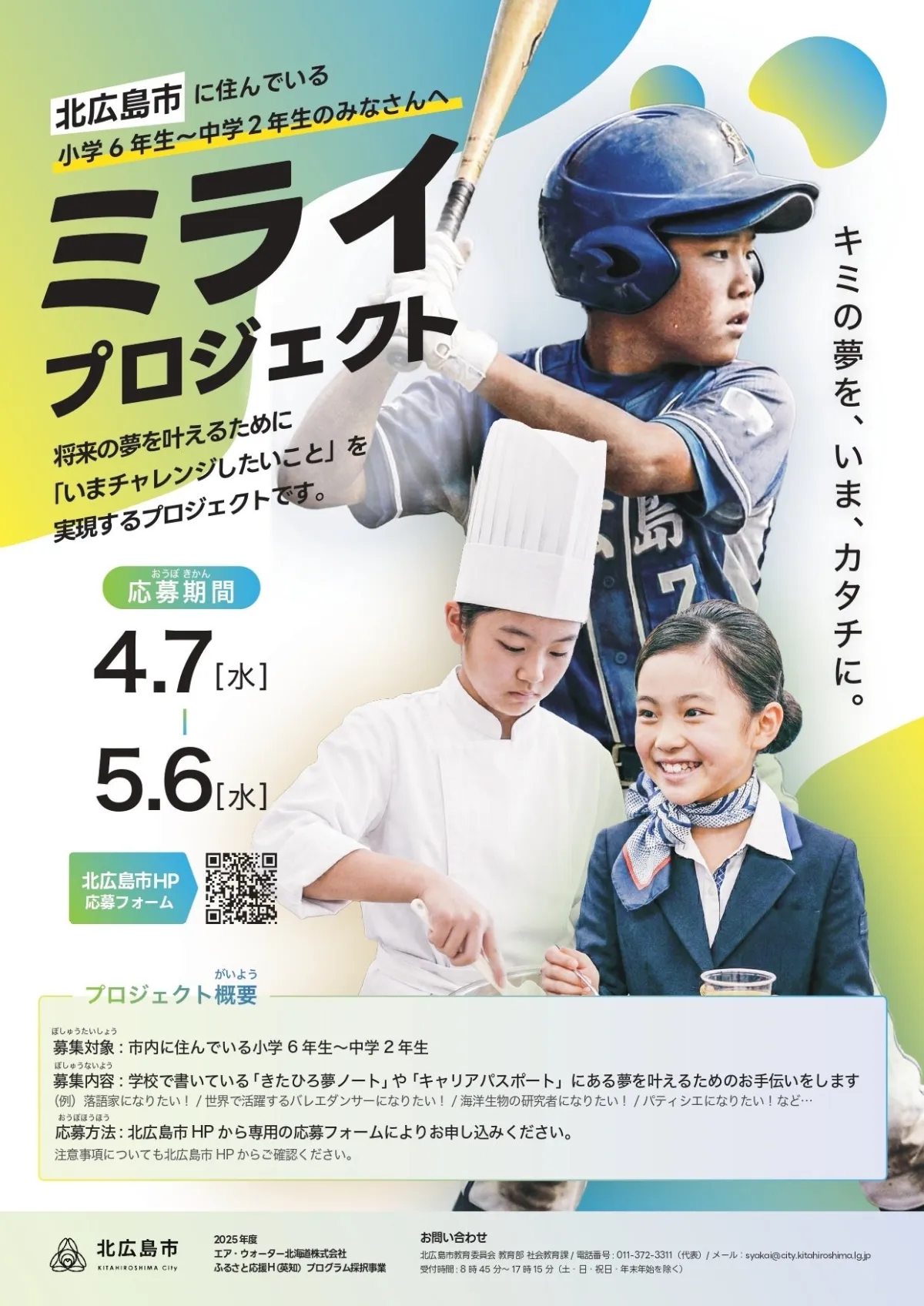 「ミライ・プロジェクト」とは、北広島市が市内に住む小学6年生から中学2年生を対象に、子どもたちが夢に向かって「チャレンジ」することを応援する横断的な事業です。このプロジェクトでは、チャレンジの内容に基づいて選出された2件の夢を実現するために、行政が全面的にサポートしていきます。参加者には、必要となる「人・もの・お金」などを市がつなぎ、各応募者と協力しながら挑戦を進めていきます。