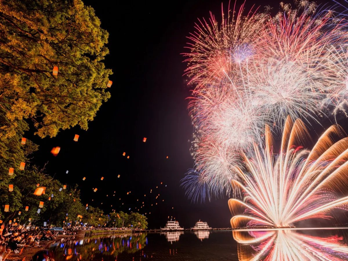 湖上からの夜の風景は格別です。約50分のナイトクルーズでは、バルーンランタンや花火が織りなす幻想的な光景を楽しむことができます。湖の水面に映る光の美しさに心を奪われること間違いなしです。
