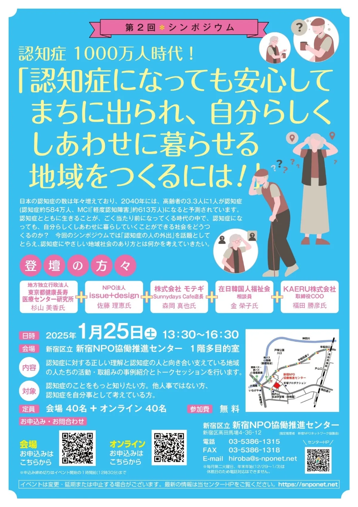 2025年1月25日(土)、新宿区立新宿NPO協働推進センターにて、シンポジウム「認知症1000万人時代! 認知症になっても安心してまちに出られ、自分らしくしあわせに暮らせる地域をつくるには!」が開催されます。このシンポジウムは、年々増加する認知症患者に焦点を当て、誰もが暮らしやすい地域作りの方法を考える場です。