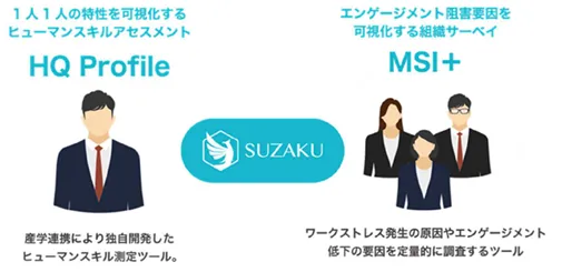 一方、SUSも、組織心理学に基づいた人材育成ツール「HQ Profile」を開発し、HRプラットフォーム「SUZAKU」を運営。これにより、企業は高精度な分析を基に「適材配置」や「育成」、さらには「採用」や「評価」といった業務を効率的に行うことができるようになっています。