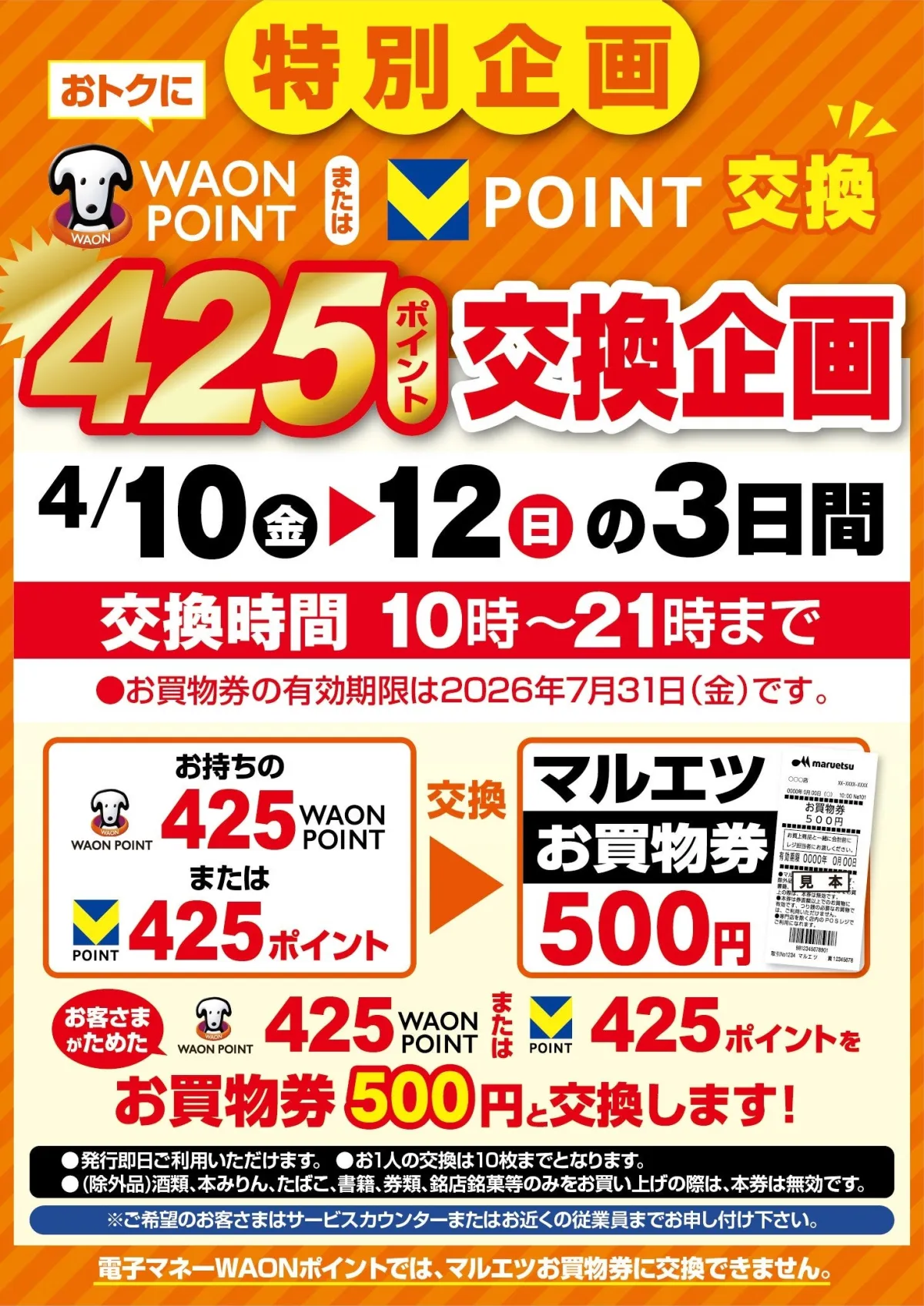 先日、株式会社マルエツが発表した新たな交換企画が注目を集めています。2026年4月10日から4月12日までの3日間、マルエツ全店舗(魚悦糀谷店を除く)にて、持っているWAON POINTまたはV POINTを使って、500円分のお買物券と交換できる特別なキャンペーンを実施します。この機会を利用すれば、425ポイントで500円券を手に入れることができるため、通常の交換条件よりもお得感が増しています。