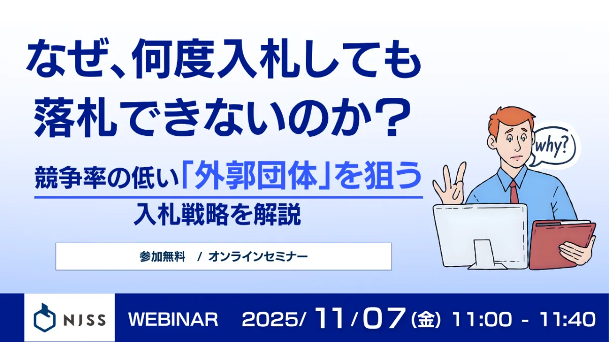 このような厳しい状況を打開するため、本ウェビナーでは「NJSS」という入札情報速報サービスを活用し、外郭団体の案件を効率的に攻略する手法を紹介します。外郭団体とは、日本郵政グループやJRA、URなど、国や自治体と連携する約2,000の公的機関のことを指します。これらの機関は、一般的には注目されることが少なく、入札の競争率は低くなっています。