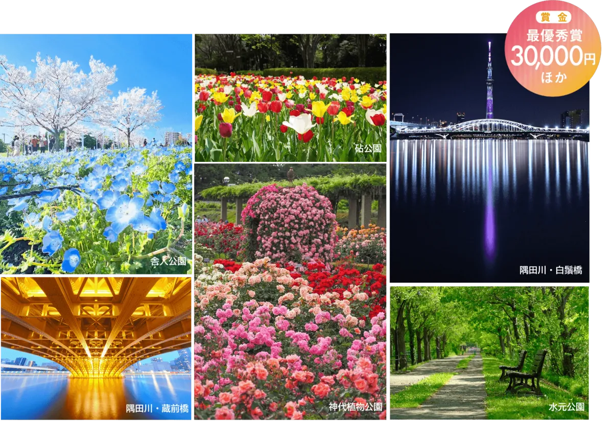 コンテストの募集期間は、2026年3月27日(金)から5月20日(水)までです。テーマは「都立公園・庭園・隅田川でたのしむ春」。春の花々やお花見、また隅田川周辺の風景を撮影した写真を大募集します!