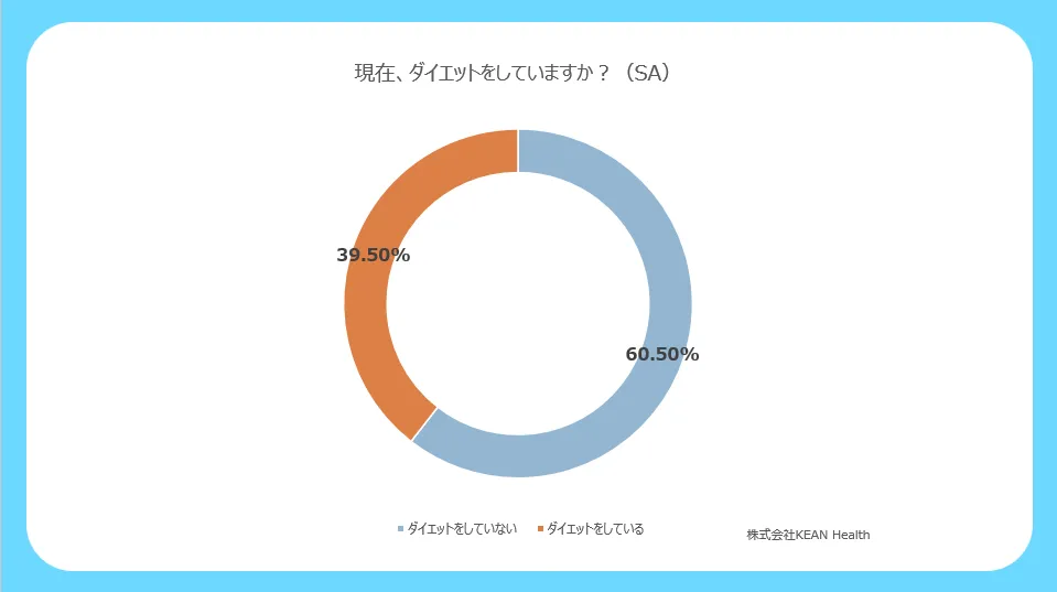 調査結果によると、現在ダイエットを行っていると回答した女性は39.5%にとどまりました。この数字は比較的少なく感じるかもしれませんが、近年では「痩せること」だけでなく「健康的なボディメイク」が重視されていることが影響していると考えられます。